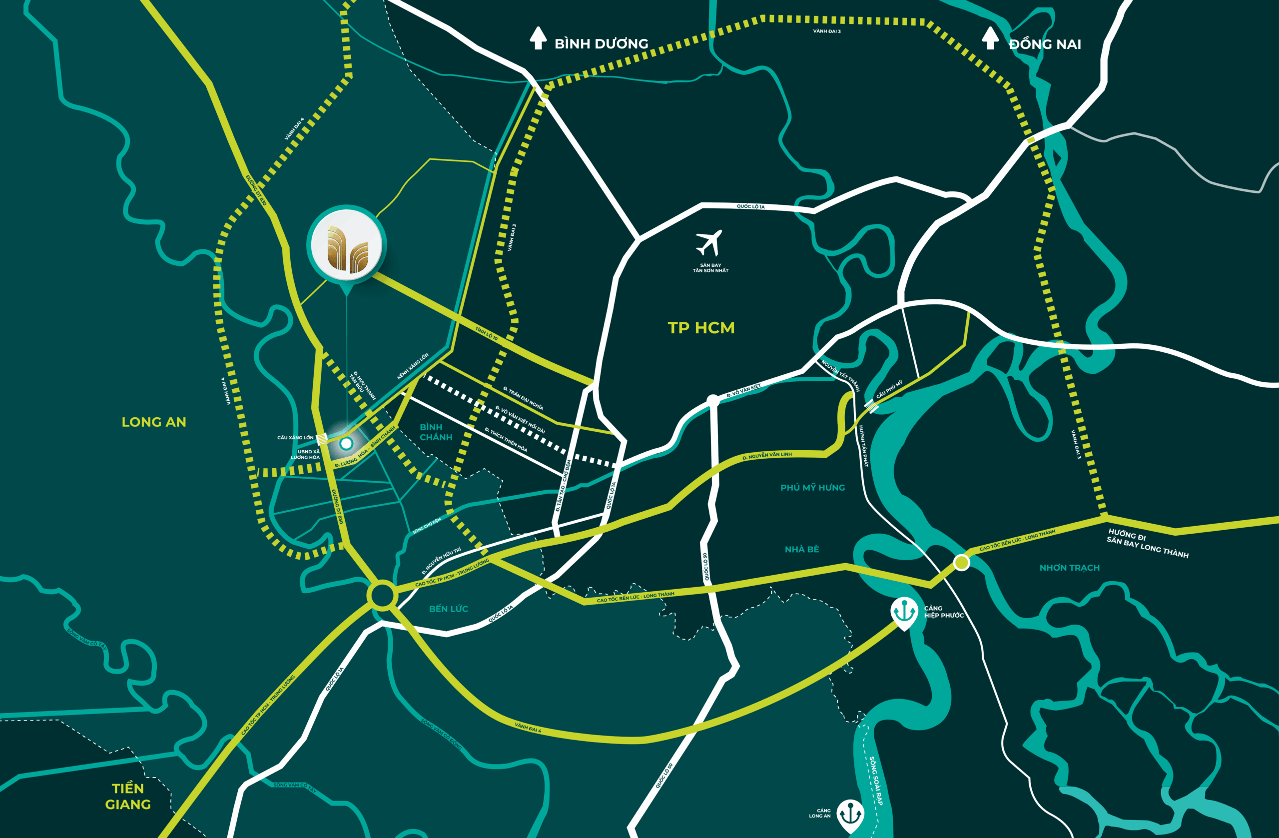 La Home Long An sở hữu vị trí đắc địa trên mặt tiền đại lộ Lương Hòa (lộ giới 60m), liền kề TP.HCM. Dự án kết nối nhanh đến cao tốc TP.HCM – Trung Lương, QL1A, Vành đai 3 & 4, thuận tiện giao thương khu Tây Nam Bộ. Hạ tầng phát triển đồng bộ giúp gia tăng giá trị bất động sản vượt trội.