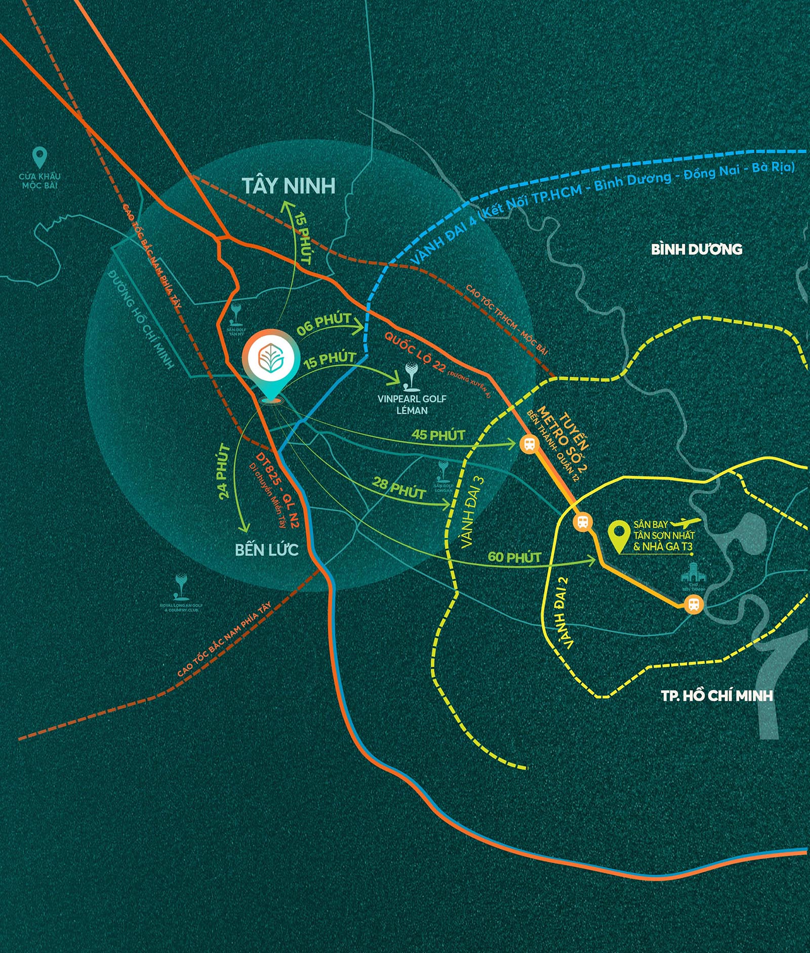 Vinhomes Green City tọa lạc vị trí chiến lược, là tâm điểm của TP.HCM và tam giác kinh tế phía Nam. Chỉ mất 15 phút từ trung tâm Tây Bắc TPHCM, hơn 60 phút đến sân bay quốc tế Tân Sơn Nhất và khoảng 40 phút đến cửa khẩu Mộc Bài, cư dân sinh sống tại dự án dễ dàng kết nối với TP.HCM và các tỉnh lân cận như Tây Ninh, Bình Dương, Đồng Nai, Bà Rịa – Vũng Tàu, … qua mạng lưới giao thông đồng bộ, hiện đại gồm Vành đai 3, Vành đai 4, cao tốc Gia Nghĩa – Chơn Thành, Metro số 2, …